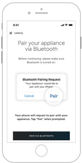 After selecting an appliance, tap Turn On Notifications to allow notifications about the appliance (ex. door left ajar). Then tap Pair Via Bluetooth.