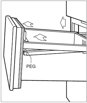 - For 36" units, there are tabs on each drawer that must be positioned between the hooks. Engage the small white pegs at the front of each drawer slide with the holes at the front of the drawer tub.