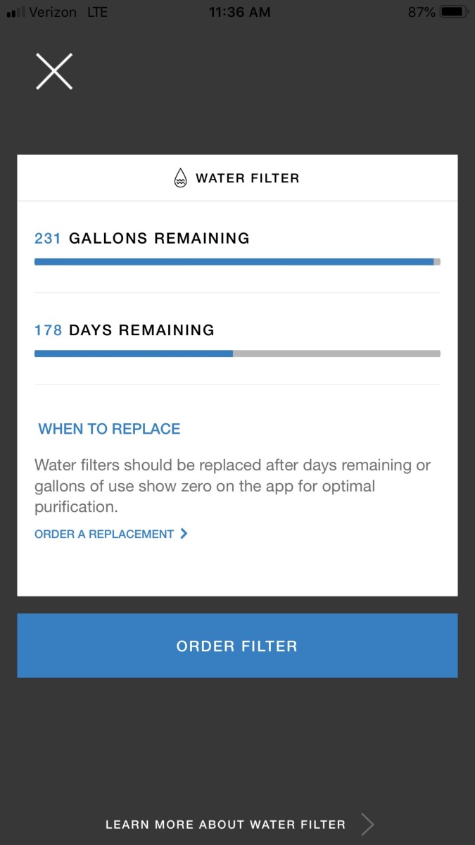 - New filter shows 235 gallons remaining instead of 750