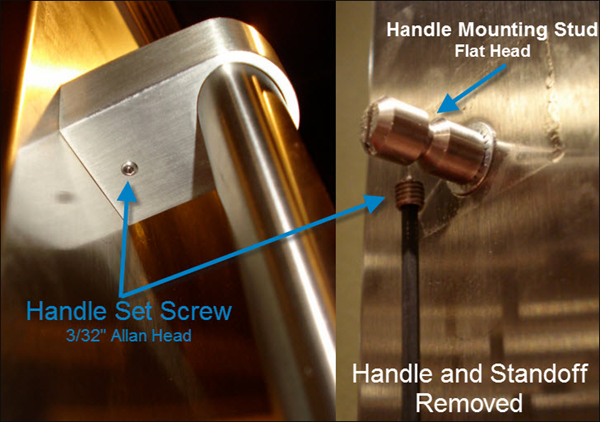 - Remove the handle by removing the set screws from the underside of both handle standoffs. Refer to the images above.