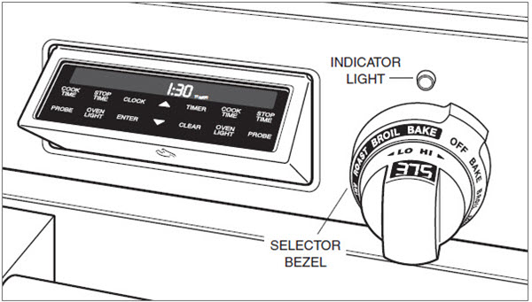 - The display shows the predetermined setpoints by mode and allows adjustments (ex. Bake will automatically set at 350°F). This functions as a two-step on feature.
