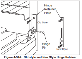 - NOTE: On units with a new style single hinge retainer plate, as shown down below, it will require the removal of skirt before door removal.